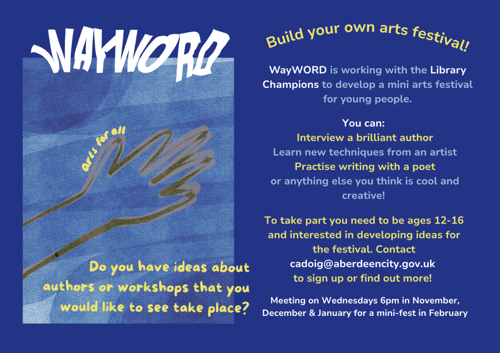 You need to be 12-16yrs to take part, and you need to have an interest in developing ideas for next year’s WayWORD Festival on behalf of young people.